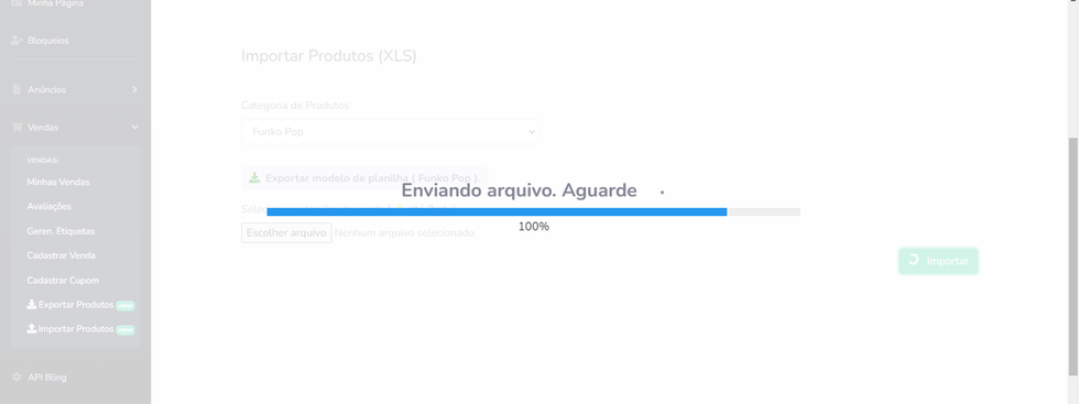 Nessa página, selecione a ‘Categoria de Produtos’, escolha o arquivo em seus documentos (o arquivo deve conter até 8mb) e clique em ‘Importar’. O processo será iniciado e, se todos os itens estiverem preenchidos corretamente, o upload deverá ocorrer com sucesso.