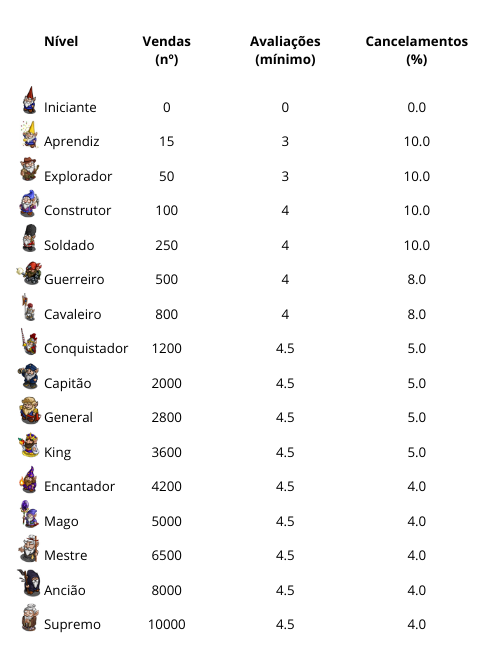 Ao se cadastrar em nosso site ou se já possui um cadastro, você terá direito a 15 vendas sem nenhuma cobrança de taxa e ainda poderá cadastrar um número ilimitado de anúncios. Depois que atingir essa quantidade e chegar na categoria Aprendiz, haverá a cobrança da taxa de comissão conforme a tabela abaixo: